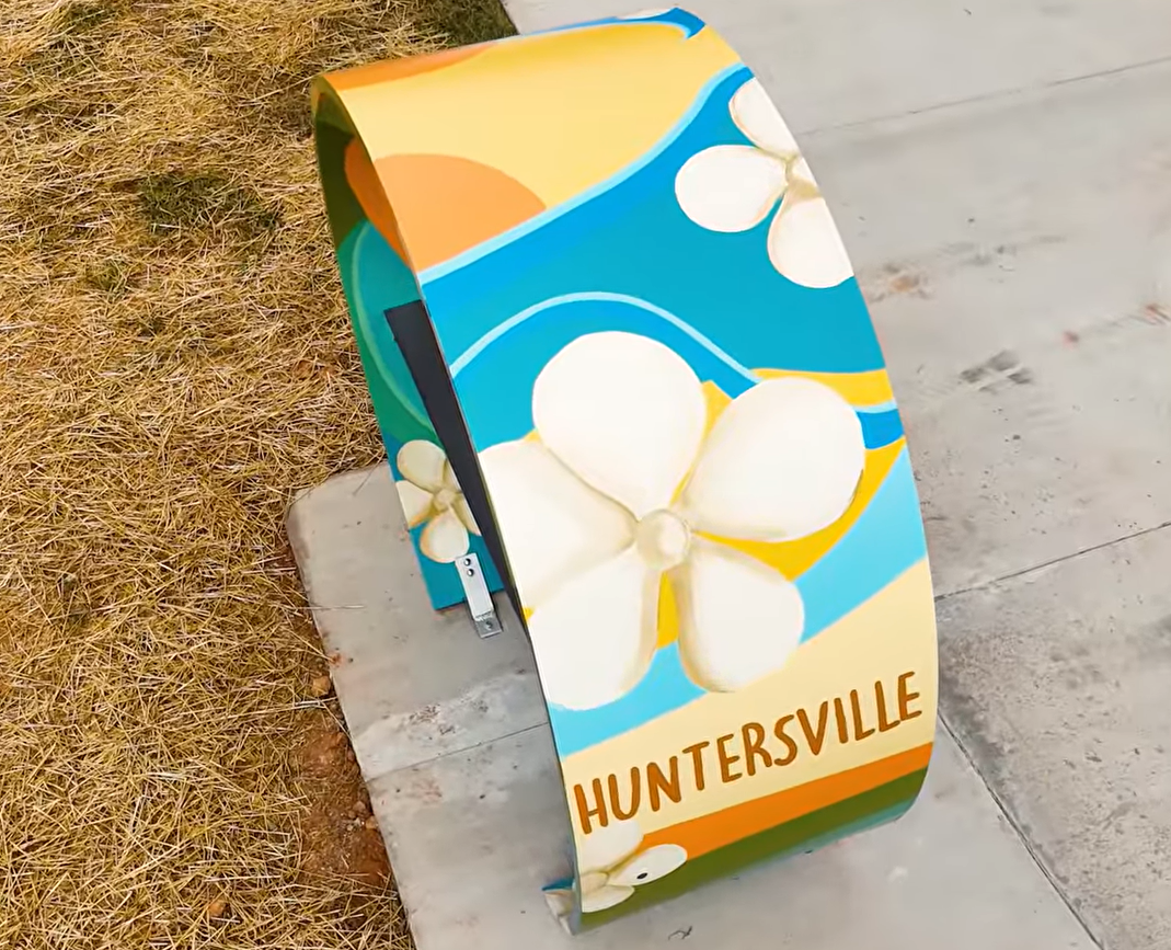 Winds of Welcome is a vibrant celebration of community and place. Flowing abstract patterns symbolize movement, growth, and connection, weaving in subtle nods to Huntersville’s natural and historic landmarks — from dogwood flowers to the rolling landscapes and waves of nearby Lake Norman.